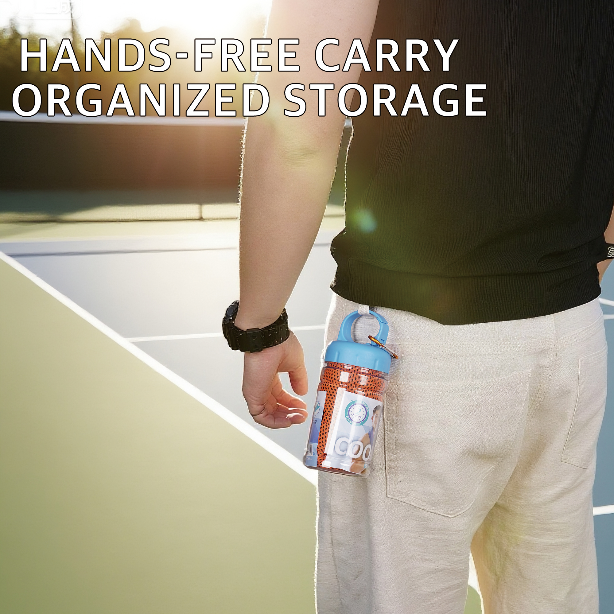 Hands-free carry—clip to your bag or fence; bottles help keep towels organized and shielded from dust.